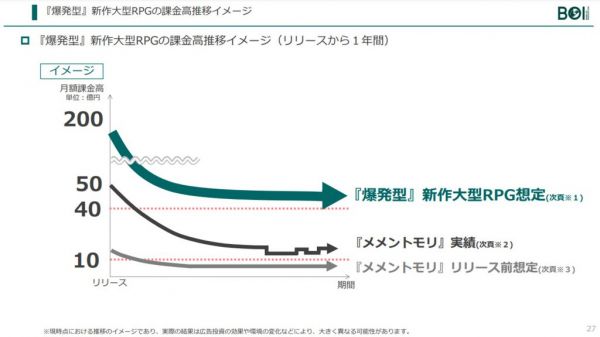 其中,BOI预计两款新RPG都是爆款型游戏,而BOI对爆款型游戏的定位是上线首月,全球销售额达到100亿日元(约4.6亿人民币)至200亿日元(约9.3亿人民币)。运营一年之后,月收入稳定在40亿日元以上(1.8亿人民币)。
