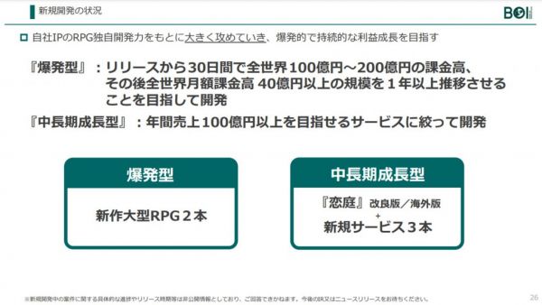 有意思的是,BOI在财报中将自己公司未来计划中的《恋庭》海外版及两款新RPG,分为了“爆款型游戏”和“中长期成长型”。