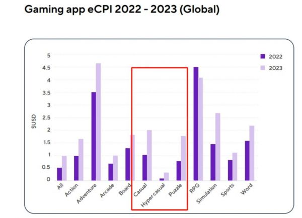 另外,Adjust最近的报告显示,受到买量成本剧增的影响,2023年整体下载量增长受到冲击,其中,休闲、超休闲和解谜品类是“重灾区”,与2022年相比eCPI都增长了一倍甚至更高,这就意味着休闲赛道的回本周期增加。