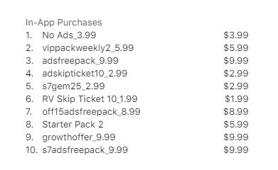 在提供激励广告的同时,《Screw Jam》还提供了多个内购选项,从应用商店消息来看,该游戏最受欢迎的内购是金币和困难关卡促销礼包,去广告居然排在了Top 5之后,意味着这款游戏的内购与IAA收入比很可能比较均衡。
