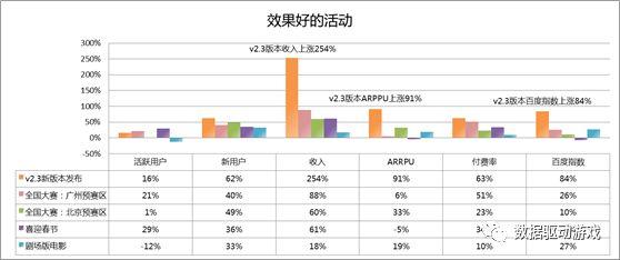 说明:从严格意义上讲,游戏版本更新不属于活动,但因为该游戏的两个版本更新均内置了多个游戏活动,比如登录领取,因此将V2.1和V3.1版本更新纳入了活动效果评估范围。