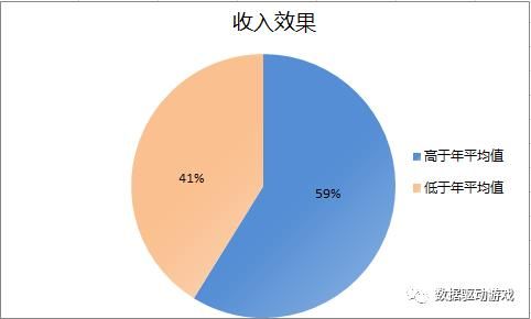 同样,将各个活动期间的收入(日均值)和2016全年的日均收入对比得出,高于年平均收入的活动数量占比59%,而低于年平均值的活动数量占41%,说明活动对收入的提升效果较为一般,主要由于收入受游戏内抽卡活动的影响较大。如下图所示。