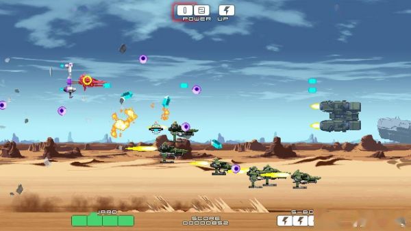 首先是画面方面,虽然为了保持怀旧的氛围而依然采用了带有像素特征的画风,但很明显,这款游戏不是马赛克的那种像素,而是十分精致细腻的画质,通过像素的形式来表现。如果在游戏场景中去看的话,会发现很多画面细节都体现出了最近几年的新游戏在画面方面应有的技术力,比如在第一关玩家飞机亮相时有一道光线的表现,非常帅气。敌人飞机攻击时的弹幕以及玩家飞机进行吸收操作的时候,都有不错的光影特效,这些都是古早的马赛克像素达不到的效果。