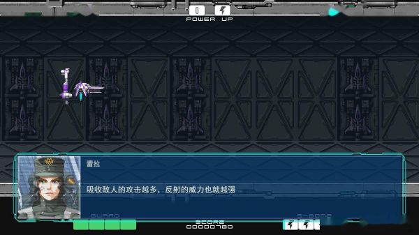 这个设定让这两类玩家都可以获益并得到自己需要的游戏体验,这就非常巧妙。操作不好的玩家就不要想着去主动接敌人的子弹或者激光来杀敌了,就当是一个传统的横版飞行射击游戏一样操作,老老实实靠自己的子弹杀敌,把吸收功能当护盾用就好了。