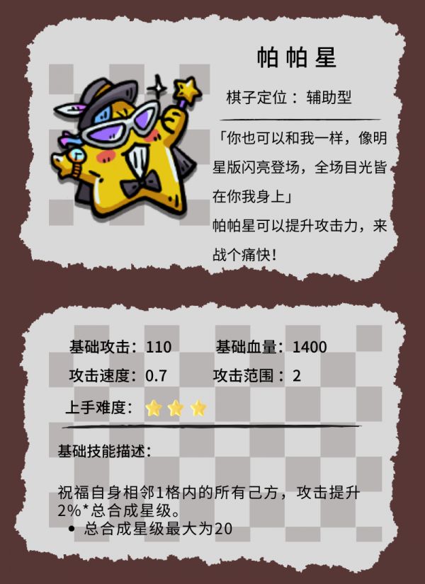 本期给弈士们介绍的新棋子是「帕帕星」,品质:传说,定位:辅助型;攻击伤害是多数玩家追求的,伤害越高,快乐加倍,帕帕星的技能也许可以帮助你,一起来看看吧。