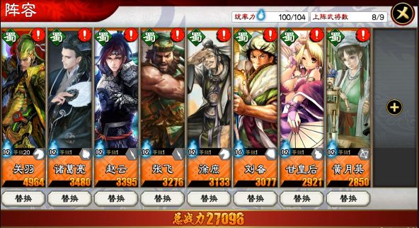 国家队:刘备、关羽、张飞、赵云、诸葛亮、黄月英、徐庶、甘皇后(可替换为“马姬、马超、关银屏”),这套属于纯蜀国流,武将间缘分的属性增幅,主公计略对本国武将伤害防御增幅,同时还可以最大化发挥国家技“蜀之人和”的增益,整体阵容 输出、治疗、控制集一体!