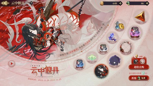 ※【云中偃月】活动为千面祈愿活动,龙子大人可通过购买【祈愿石】从祈愿奖池中随机获得一件奖品(不会重复获得相同的奖品,直至10件奖品全部获得为止),应龙「云中偃月」千面将在第六次祈福时加入奖池,此外可在活动期间通过直接购买的方式获得应龙「云中偃月」千面和「云中偃月」动态头像框。