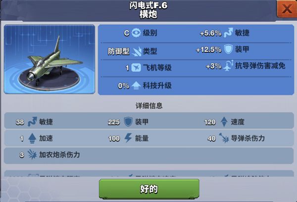 该架飞机需完成5级费默曼关卡才能解锁,在商店中推送购买需花费120钻石。它属于C级防御型飞机,装甲较厚,能有效减少敌方导弹的伤害。