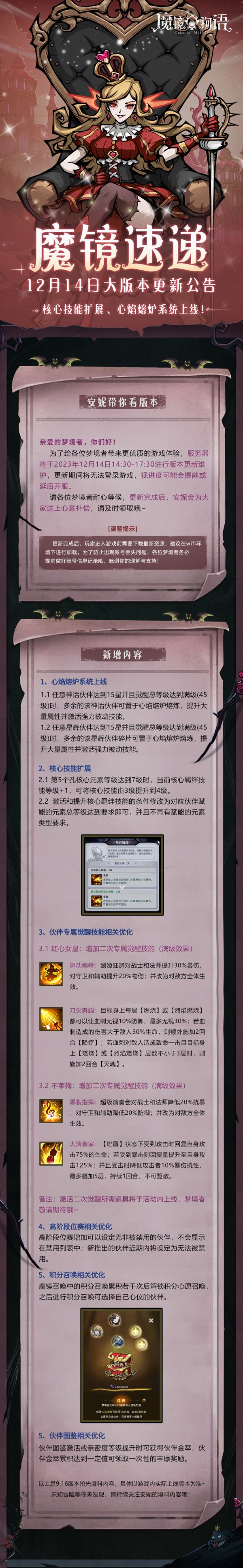 为了给各位梦境者带来更优质的游戏体验,服务器将于2023年12月14日14:30-17:30进行版本更新维护,更新期间将无法登录游戏,视进度可能会提前或延后开服。