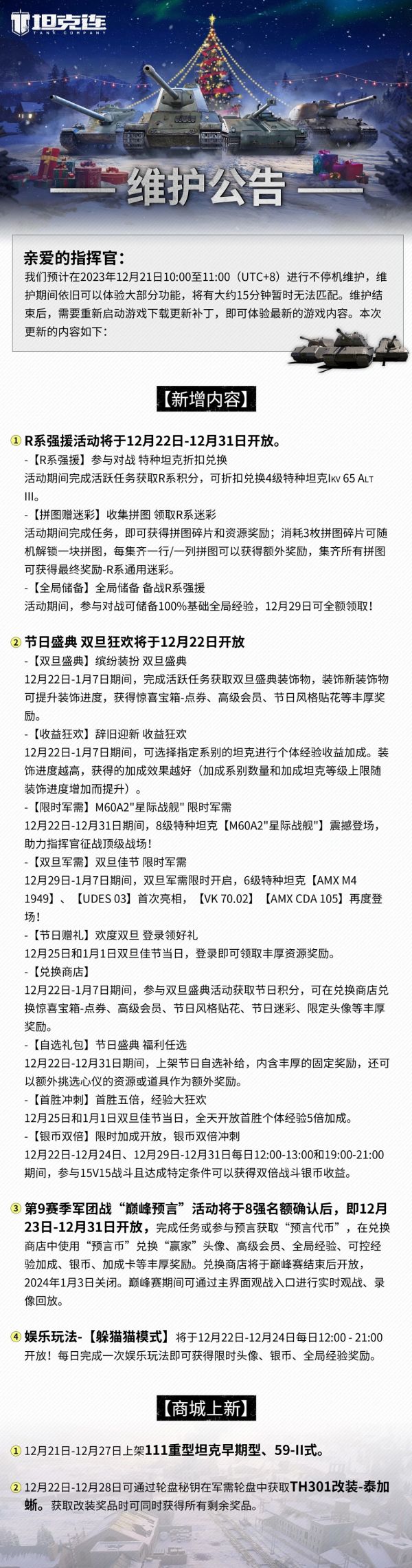 亲爱的指挥官:我们预计在2023年12月21日10:00至11:00(UTC+8) 进行不停机维护,维护期间依旧可以体验大部分功能,将有大约15分钟暂时无法匹配。维护结束后,需要重新启动游戏下载更新补丁,即可体验最新的游戏内容。本次更新的内容如下