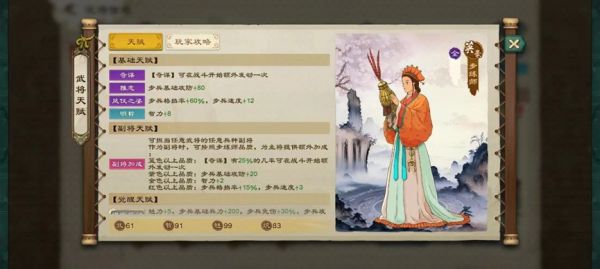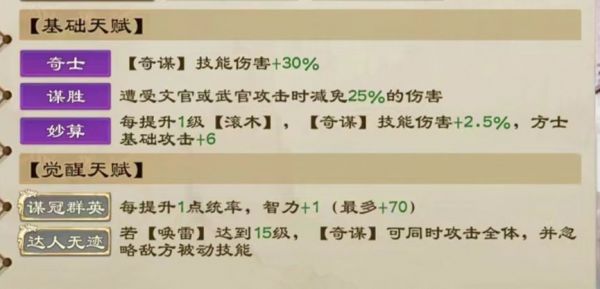 基本就照着这个属性来看,这就是文官步兵的标配毕业副将,以第一条天赋为例,奇谋有25%的概率在战前释放一次,这个技能就是为郭嘉量身定做的
