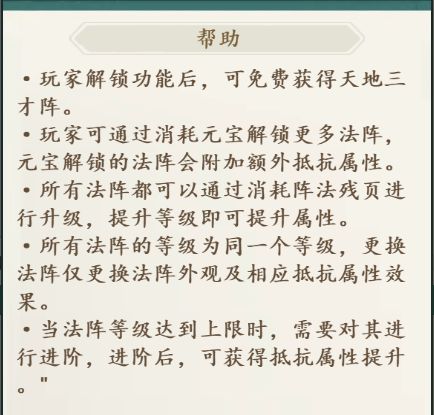 解锁阵法之后,可以用元宝学习不同的阵法,每种阵法都具有不同的效果,玩家可以根据自身需要装备阵法并提高阵法等级完成阵法进阶