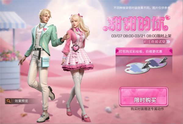 把春天穿在身上,3月7日至3月21日8点,全新时装“甜甜的你”甜蜜登场,以蝴蝶结、爱心、格纹为灵感,搭配皮革和蕾丝布料,经典芭比粉和薄荷绿演绎不一样的浪漫。活动期间该时装享受限时特价,购买时装可获得专属动作,快来试穿吧!