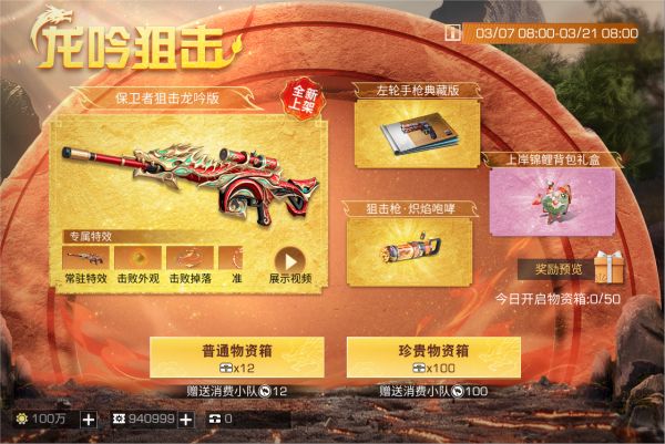 龙年就要用新武器,3月7日至3月21日8点,龙吟狙击全新上线,消耗不同数量的明日物资箱即可开启礼盒,获得保卫者狙击龙吟版涂装、左轮手枪典藏版涂装、上岸锦鲤背包礼盒等珍稀道具,更多好礼等你来开启!