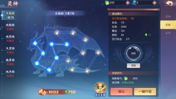 灵神阶级等级越高,五行攻击加成也就越高。共15个穴位,使用真灵元、贯通丹打通穴位,全部打通后消耗通脉符提升经脉重数。