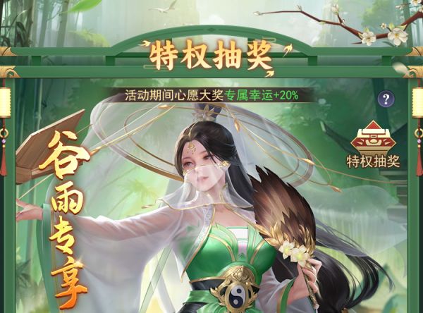 通过谷雨祈愿令进行抽取极品奖励,可随心切换不同极品奖励进行抽奖,开启特权抽奖有心愿大奖专属幸运20%加成