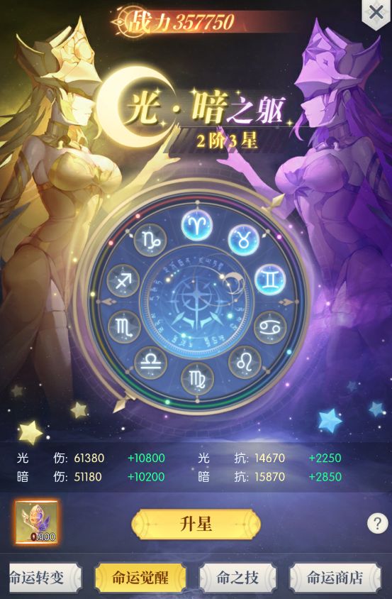 升星会增加光属性或暗属性,升够星级可突破到下一阶。但是每次突破有对应的成功率,每次突破失败后会提升对应成功率,失败后需要等待修复时间完成才能继续突破哦~
