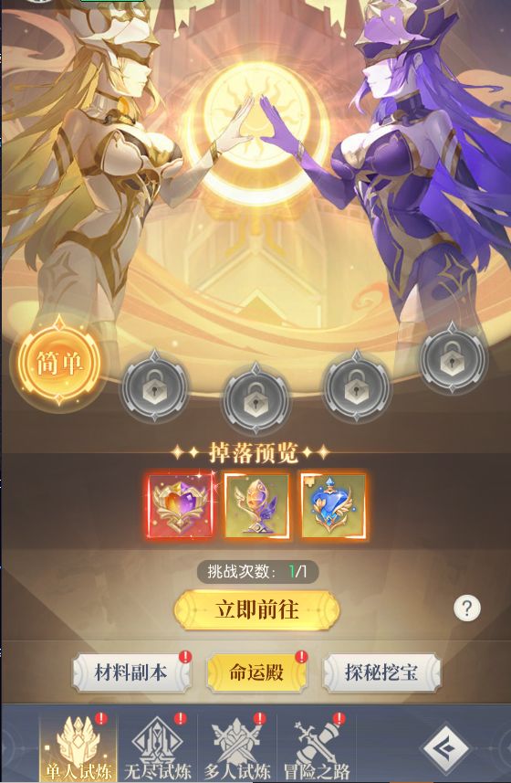 升星和突破消耗的材料需要前往命运殿获取。命运殿有五种难度关卡,通关前一个难度才能解锁下一个难度,而且每日只有1次挑战机会,冒险者们千万不要浪费呦~