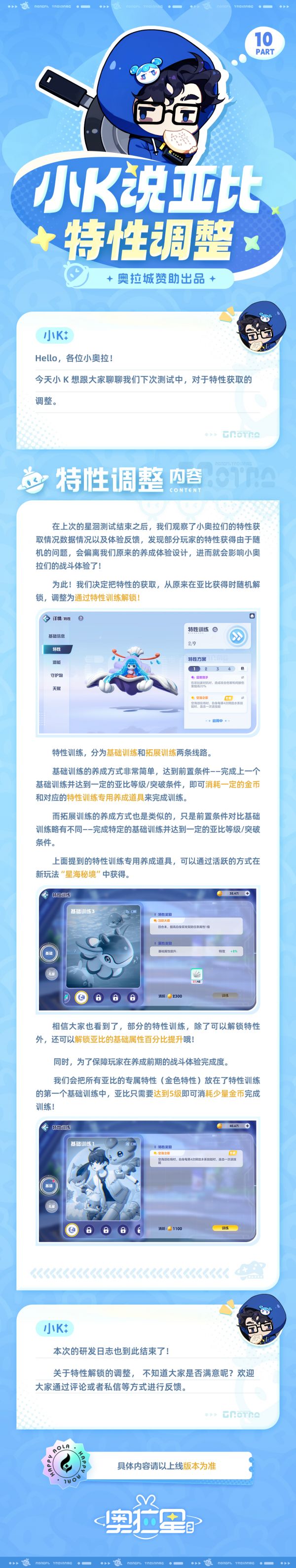 从原来的亚比获得时随机解锁,调整为通过特性训练解锁