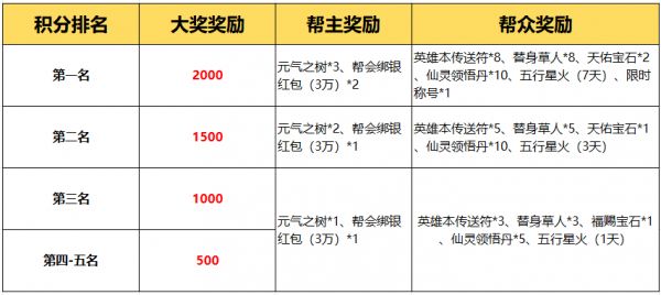 1.因本次比赛为积分制,所以将根据积分排名决定本次赛事的最终排名,积分排行前五名的帮主和帮众成员都将获得丰厚的奖励以及超多珍稀道具奖励!