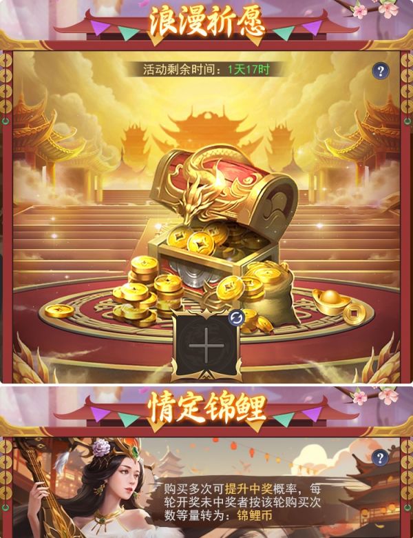通过情定祈愿令进行抽取极品奖励,可随心切换奖池,开启特权抽奖有心愿大奖专属幸运20%加成,可获得天锻陨铁、无双将魂之灵、九天玄晶等奖励