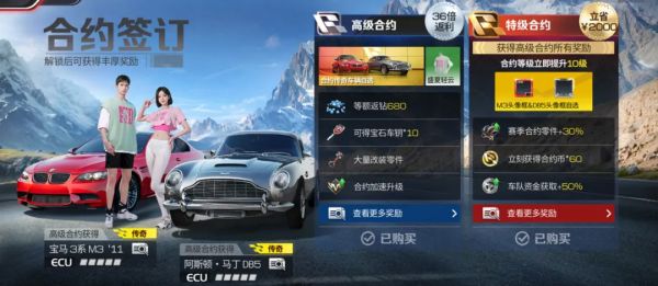 本赛季合约售价仍分为两档:高级合约68元/特级合约128元。购买合约后的车手只需达到相应等级即可在车辆奖励(阿斯顿·马丁DB5 Vantage或宝马3系 M3 '11)中二选一。