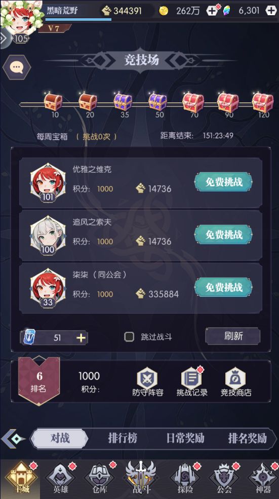 竞技场每日包含3次免费挑战,3次过后将通过消耗挑战券才可继续挑战。日常奖励与排名奖励通过邮件发放,冒险家记得相应奖励的领取~
