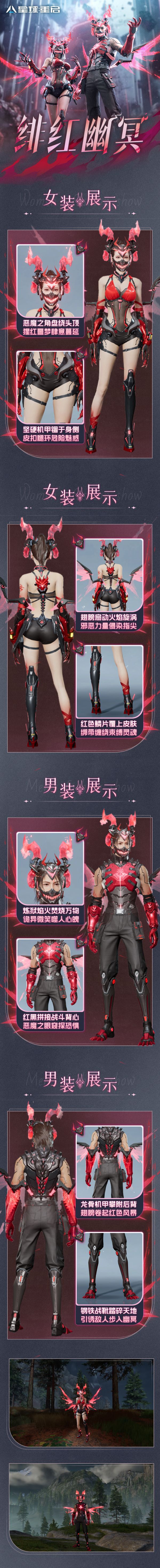被恐惧笼罩的夜色中,猩红的噩梦如幽灵般降临。「绯红幽冥」时装包含整装、发饰、面饰、手部、鞋子共五个部位,男女款均以恶魔为灵感,女款腰部镂空连体衣,性感魅力轻松拿捏,男款则为机甲背心,力量感十足!
