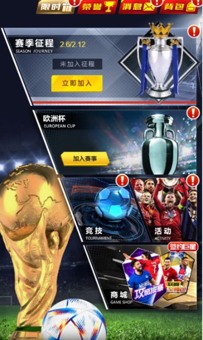 在《世界大战》的世界里,还原了最真实的欧陆足球赛事,每周一到周六系统将根据玩家选择的球队进入不同国家的欧陆赛事中,选择哪个国家的联赛就会进入对应国家的联赛中!(例:选择英超球队就会进入英超联赛中)经过联赛的比拼,名次靠前的球队将进入每周日进行的杯赛!(联赛与杯赛是全自动化的对战,无需操作)