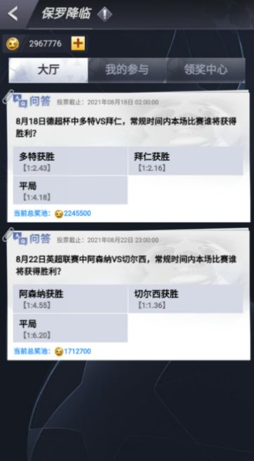 在每场赛事开始前,游戏主界面都有开赛时间提示,要记得及时排兵布阵派上最好球员,每场比赛都会影响联赛最终成绩,联赛获胜更有好礼相送!