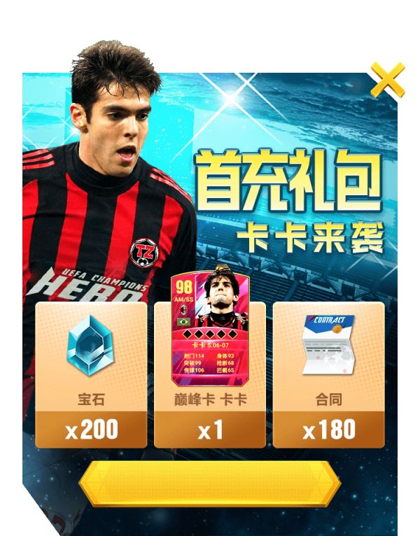 进入游戏,6元即可兑换巴西王子巅峰卡卡*1+宝石*200+合同*180;