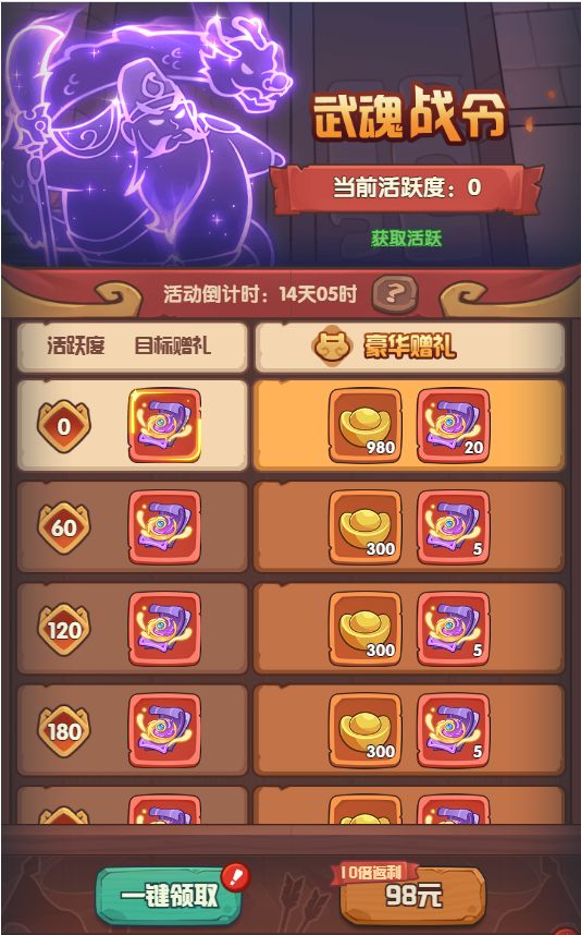 活动持续15天,期间玩家最高武将觉醒等级达到一定条件后,可领取武魂召唤劵奖励,后面的升级礼包需要额外付费购买,想加速提升武将觉醒阶级的主公推荐入手6级、8级和10级的升级礼包,里面包含大量万能觉醒碎片。