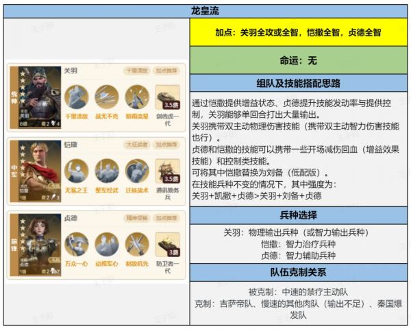 适配体系:各类快速骑兵输出队,可搭配各种骑兵输出将。如关羽,理查一世,查理曼,吉尔伽美什