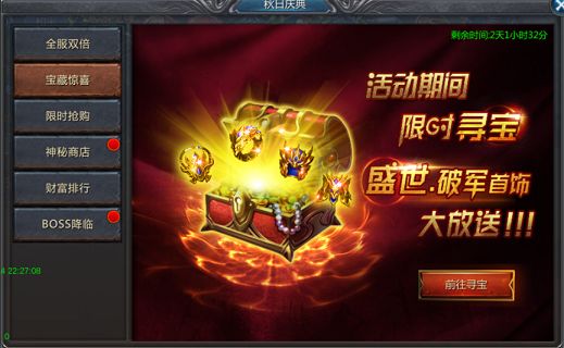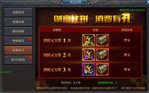 活动期间,消费满30万元宝即可参与排行,排行前3名玩家将获得顶级装备宝箱,活动结束后,奖励通过邮件发放!