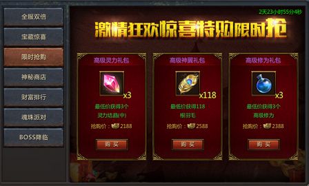 活动期间,玩家可超低折扣抢购豪华礼包,每种礼包每个玩家只可购买一次哦!