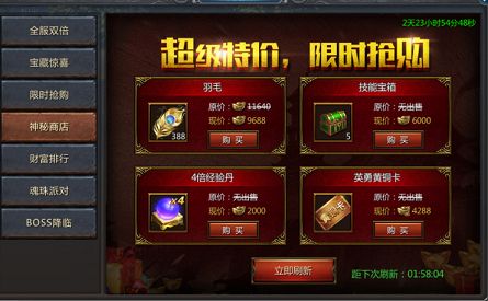 活动期间,玩家可在神秘商店刷新购买超值道具!每次刷新,每个物品限购一次,一页物品全部买完可免费刷新一次!