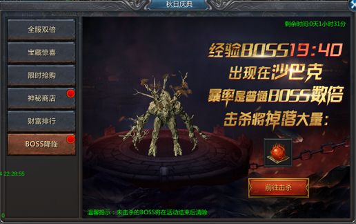 活动期间,每日19:40超级BOSS将在出现在沙巴克,击杀BOSS将掉落海量无主超级奖励!