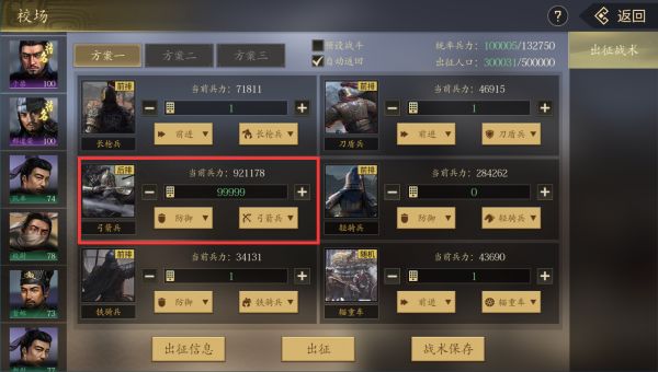 1、 在校场设置出征战术,需要带上其余兵种各1个,弓箭兵带满。(注意提高统帅值,超出武将统御兵力会降低兵种属性。)(六级及以下城池敌方没有器械兵种,以弓箭兵为主力部队;六级以上城池敌方出现器械兵种,以投石车为主力部队)
