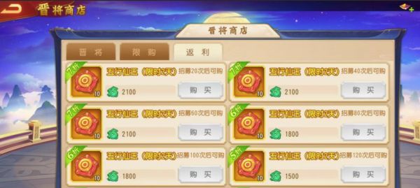 5、招募会产出晋将整将、晋将碎片、五行灵尘、金色万能神兵,元宝等资源。在活动中招募满一定次数后,主公可以在晋将商店的返利页签中,以折扣价购买五行仙玉,返利商店购买的五星仙玉只可用于本次晋将活动;