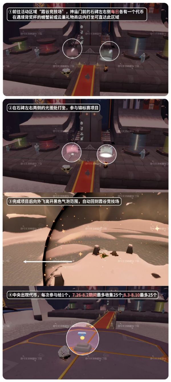 「参与锦标赛」进入霞谷竞技场,在神庙门前石碑左/右光圈处打坐参与并完成一场锦标赛