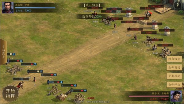 1、 在校场设置出征战术,其余兵种各携带1个,尽量带满投石车。(注意提高统帅值,超出武将统御兵力会降低兵种属性。)