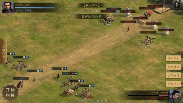 2、 首先指挥停止铁骑兵,其余兵种前进一回合后停止。依次攻打敌方轻骑兵、铁骑兵、长枪兵、刀盾兵、冲车。