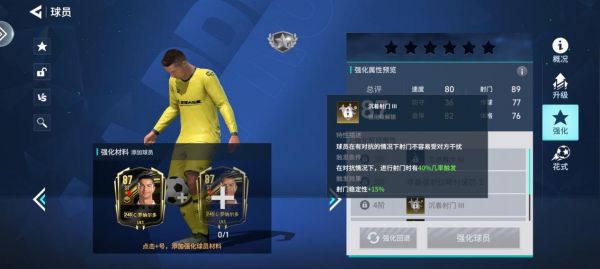 球员数据界面点击右侧强化,在属性预览中点击球员特性