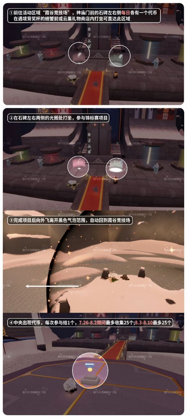 「参与锦标赛」进入霞谷竞技场,在神庙门前石碑左/右光圈处打坐参与并完成一场锦标赛