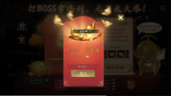 击杀BOSS不仅可以获得大量的装备,同样可以获得大量的BOSS红包,每天都有12次开启的机会哦。