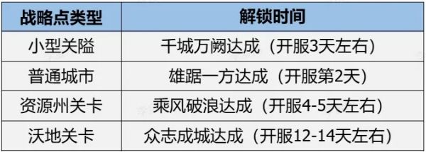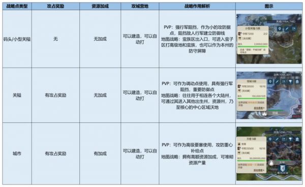 可将游戏内所有联盟可攻打的公共城池/关隘,分为三个类型,以下做表说明: