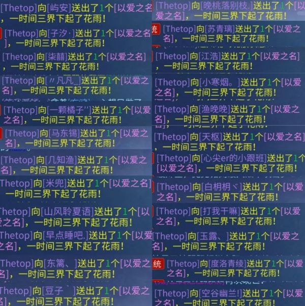 投稿小姐姐表示:“来自壮志凌云的漂亮大佬的雨露均沾。凌晨两点多,在游戏的小伙伴们,小姐姐几乎给每一个人都送出一朵以爱。还有很多花花都没有截到图,她真的是非常好的一位小姐姐!”