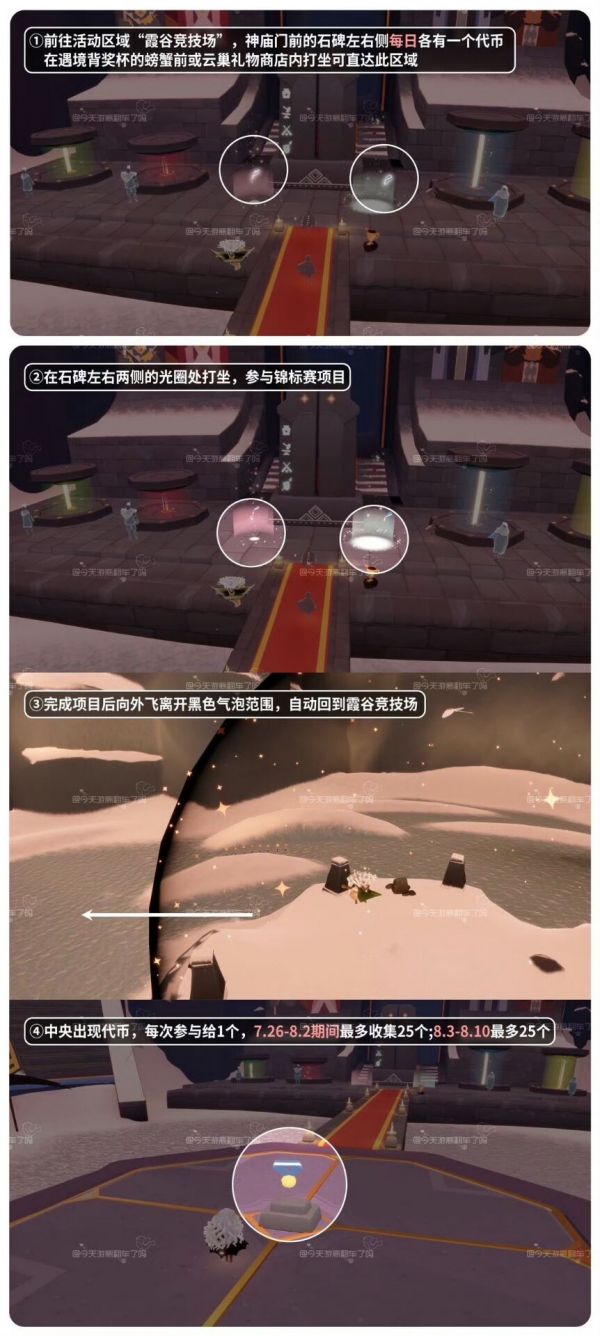 「参与锦标赛」进入霞谷竞技场,在神庙门前石碑左/右光圈处打坐参与并完成一场锦标赛