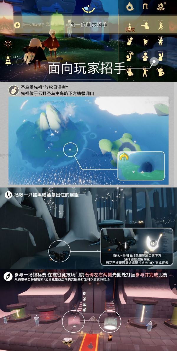《光遇》游戏中每天的每日任务及大蜡烛的位置都不相同,玩家完成每日任务及收集大蜡烛都可以得到丰厚的兑换奖励,奖励可以用于兑换各种动作及道具,不过很多小伙伴不知道每日任务怎么做,又懒得自己去找大蜡烛的位置,我们汇总了每日任务的完成攻略以及蜡烛位置,一起来看看吧!