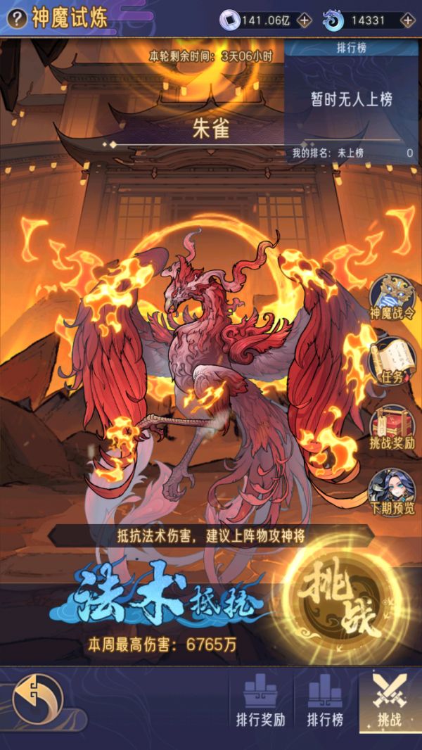 每周1/3/5会开启物免试炼,每周2/4/6则是另外的魔免试炼,每周日进行极限试炼;小貔貅这里提醒大家一句,要记得上阵对应伤害类型的神将才能对首领造成伤害噢!